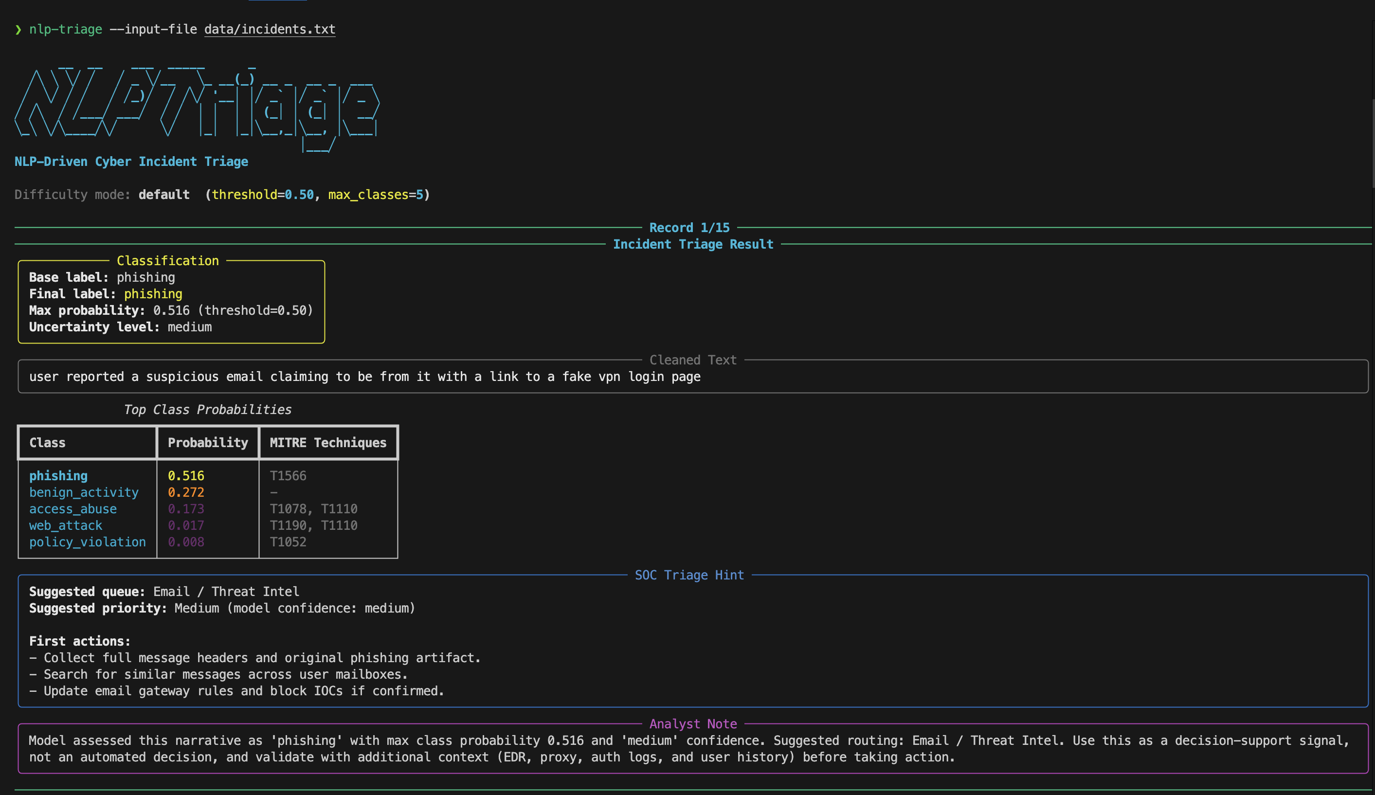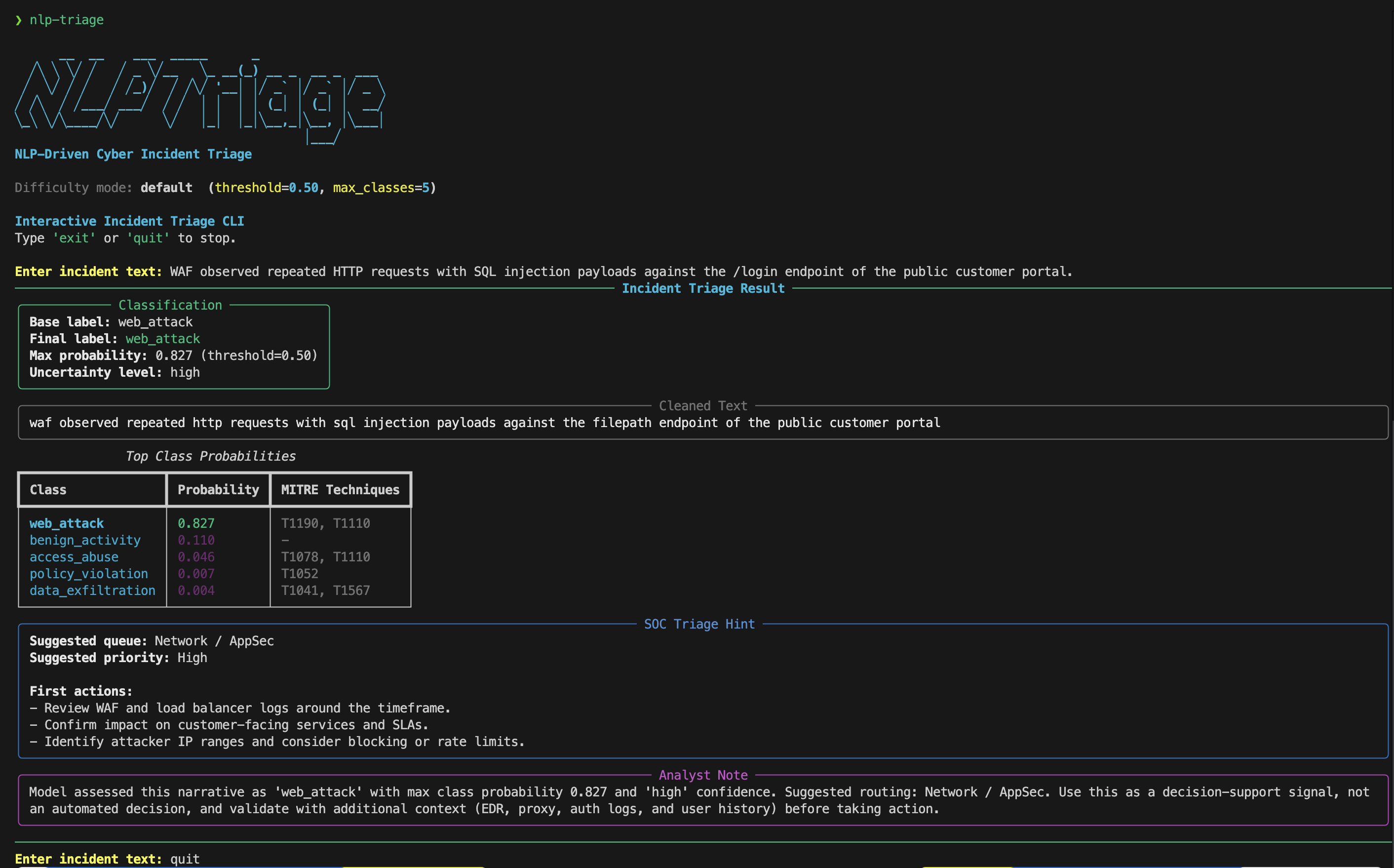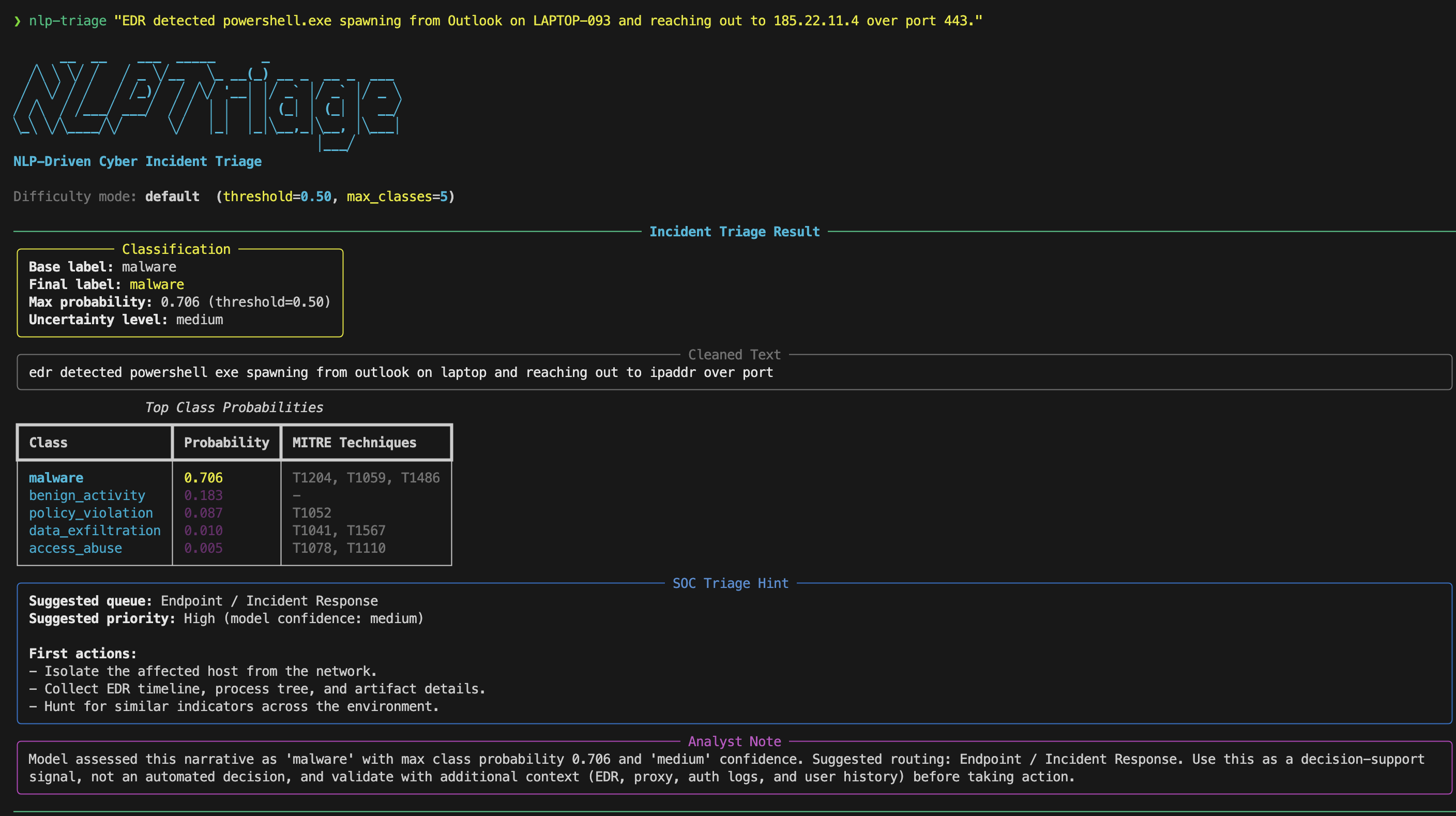 Each input is: - Cleaned using training‑consistent normalization - Vectorized using TF‑IDF model - Classified with uncertainty handling and difficulty rules - Mapped to MITRE ATT&CK via keyword + heuristic extraction - Displayed using Rich panels for quick SOC triage