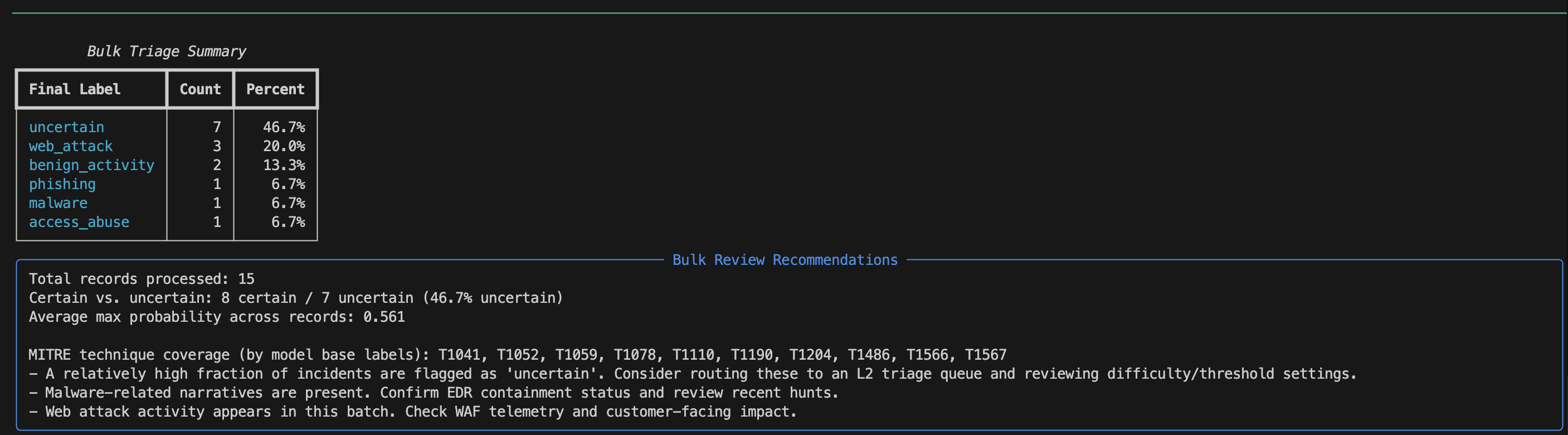 At the end of processing, NLPTriage prints a batch summary including: - Per‑class distribution - Most frequent MITRE techniques observed - Uncertain predictions count - Recommendations (e.g., raise threshold, retrain, add rules)